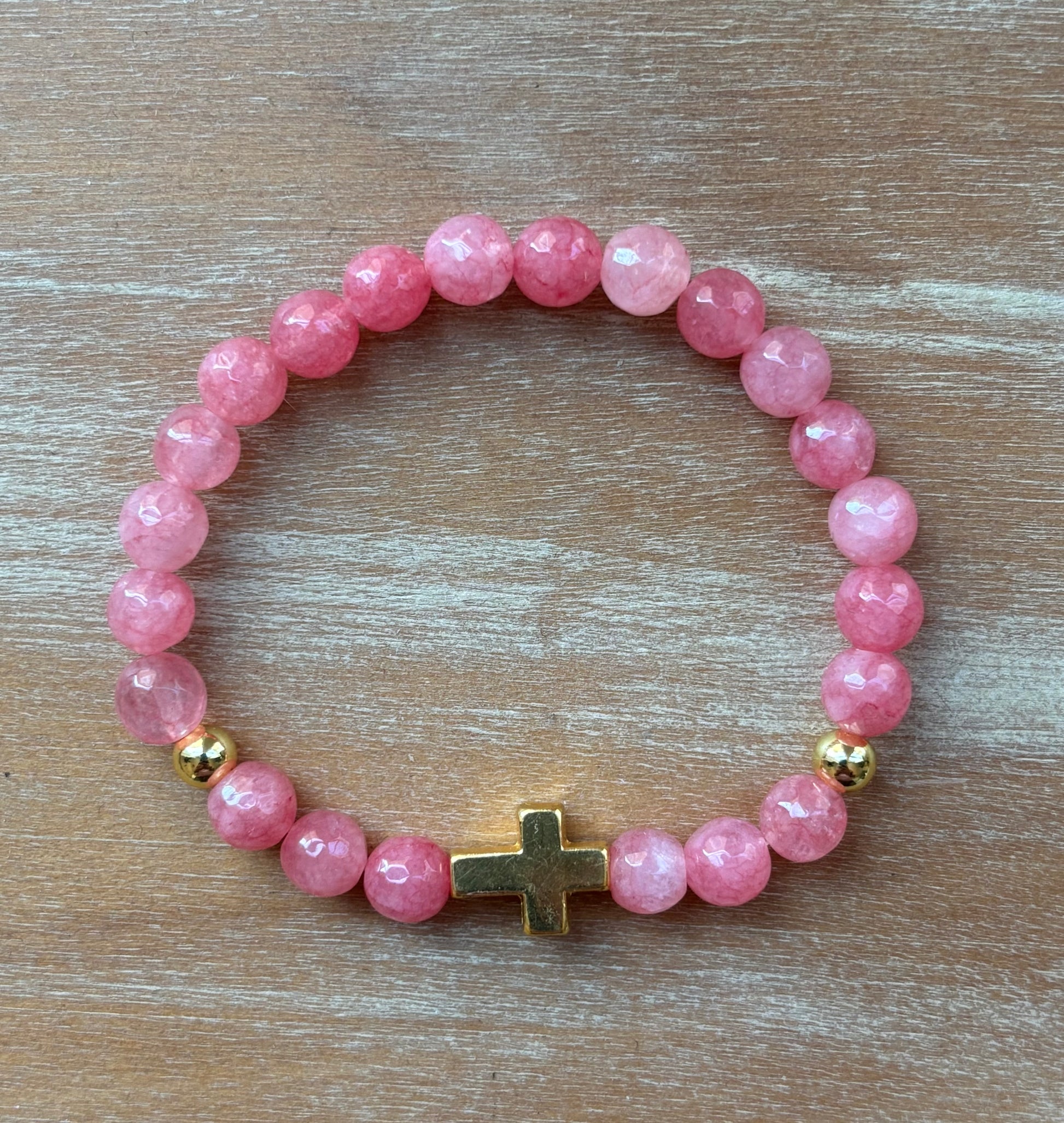 Faith and elegance come together in this handcrafted stretch bracelet. Featuring 8mm faceted pink chalcedony beads, accented with 6mm gold-plated spacer beads and a bold gold cross centerpiece, this piece is both stylish and meaningful. The soothing pink chalcedony stone is known for promoting peace and compassion, while the cross serves as a reminder of strength and unwavering faith.